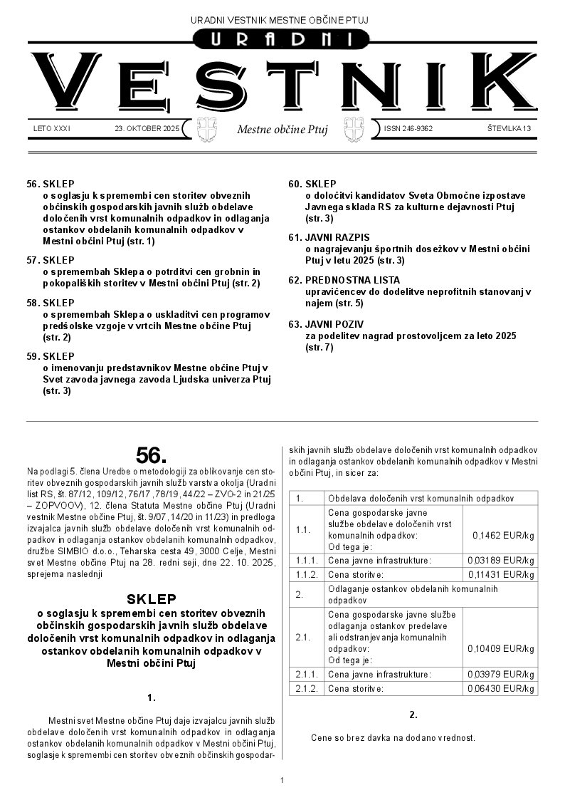 Sklep o soglasju k spremembi cen storitev obveznih občinskih gospodarskih javnih služb obdelave določenih vrst komunalnih odpadkov in odlaganja ostankov obdelanih komunalnih odpadkov v Mestni občini Ptuj (URADNI VESTNIK MESTNE OBČINE PTUJ, ŠT. 13/2025)