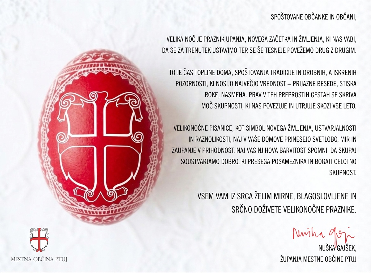 Velikonočne pisanice, kot simbol novega življenja, ustvarjalnosti in raznolikosti, naj v vaše domove prinesejo svetlobo, mir in zaupanje v prihodnost. Naj vas njihova barvitost spomni, da skupaj soustvarjamo dobro, ki presega posameznika in bogati celotno skupnost.