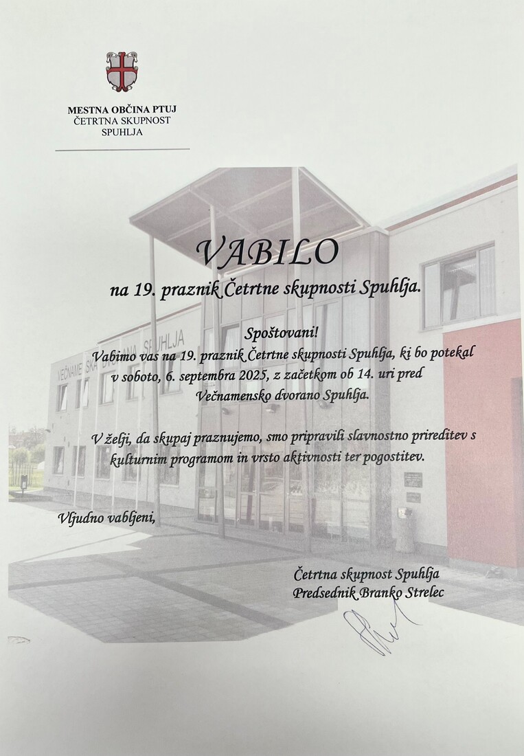 Vabimo vas na 19. praznik Četrtne skupnosti Spuhlja, ki bo v soboto, 6. septembra 2025, od 14. ure dalje pred Večnamensko dvorano Spuhlja.