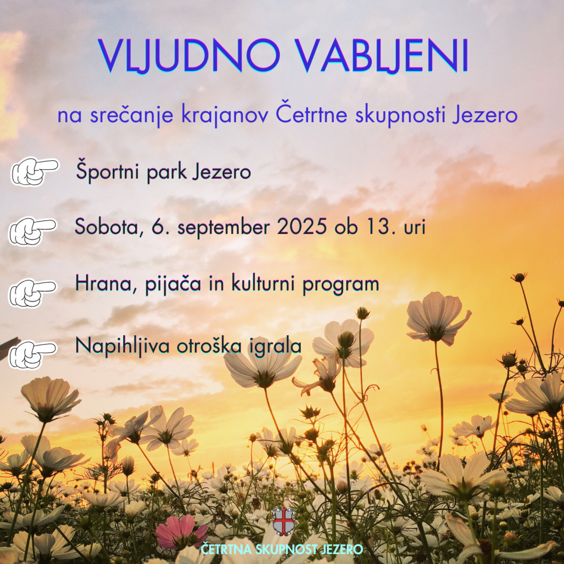 Vabljeni na srečanje krajanov Četrtne skupnosti Jezero, ki bo v soboto, 6. septembra 2025, od 13. ure dalje v Športnem parku Jezero.