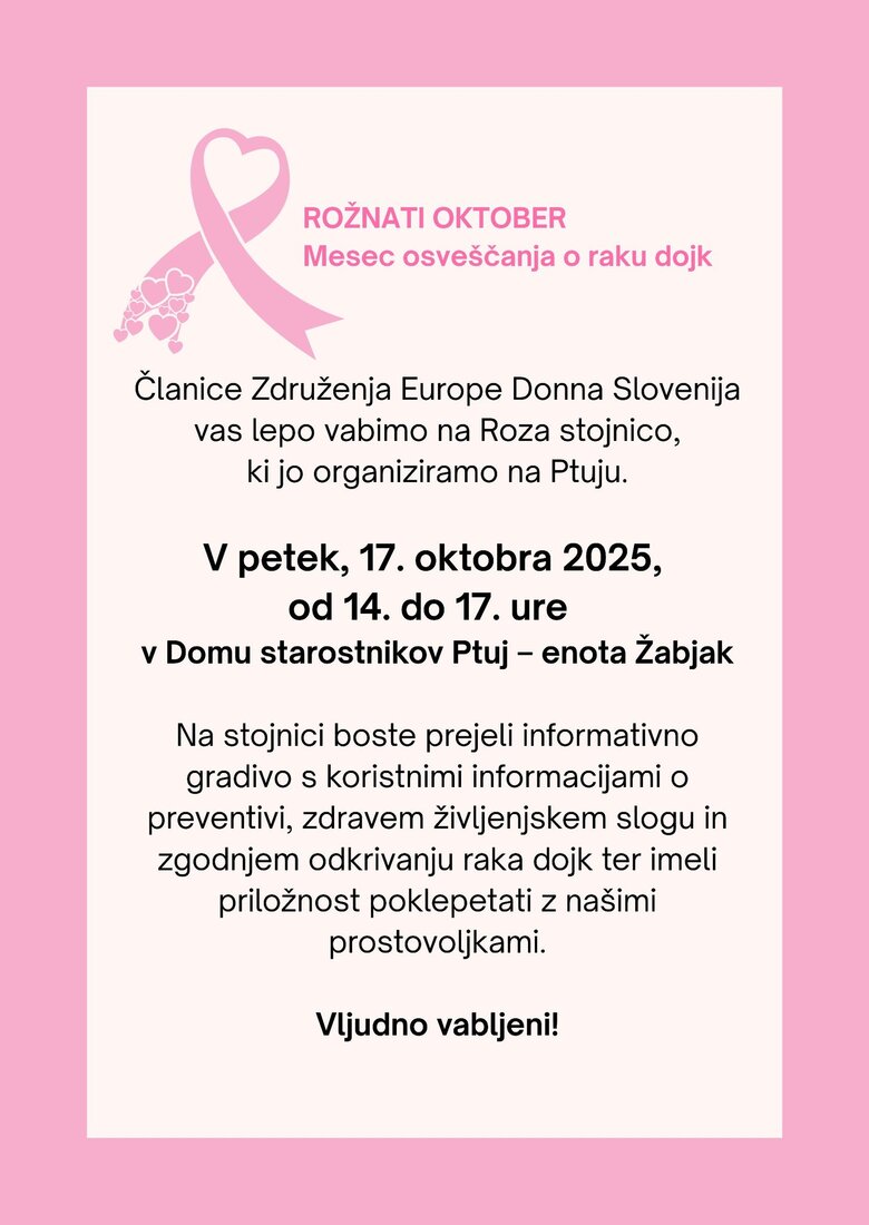 Članice Združenja Europa Donna Slovenija vas lepo vabimo na Roza stojnico, ki jo organiziramo na Ptuju - v petek, 17. oktobra 2025, od 14. do 17. ure v Domu upokojencev Ptuj - enota Žabjak.