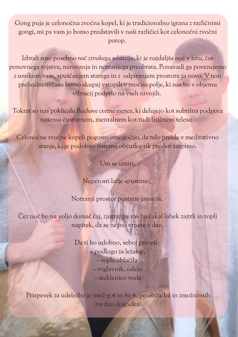 Izbrali smo posebno noč zimskega solsticija, ki je najdaljša noč v letu, čas ponovnega rojstva, mirovanja in notranjega preobrata. Ponavadi ga povezujemo z umikom vase, spuščanjem starega in z odpiranjem prostora za novo. V tem prehodnem času bomo skupaj vstopili v zvočno polje, ki nas bo v objemu vibracij podprlo na vseh nivojih.