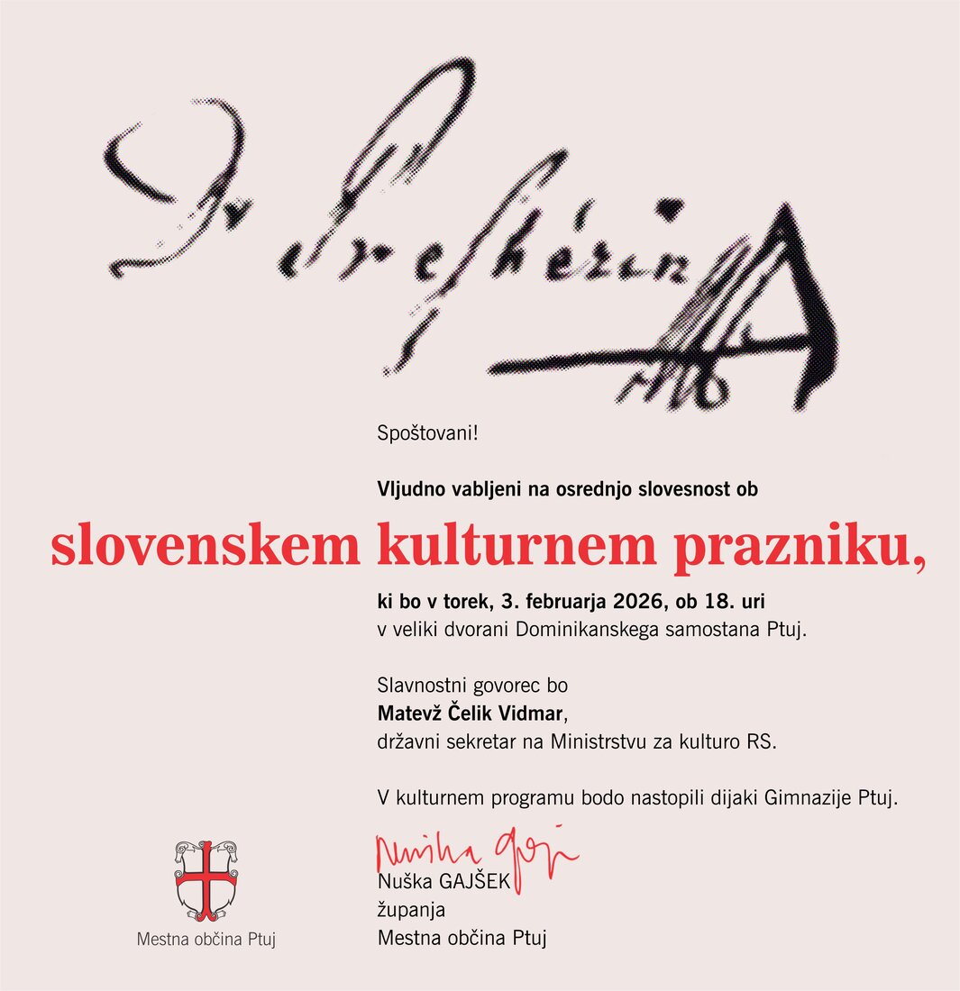Vabljeni na osrednjo slovesnost ob slovenskem kulturnem prazniku, ki bo v torek, 3. februarja 2026, ob 18. uri v veliki dvorani Dominikanskega samostana Ptuj.