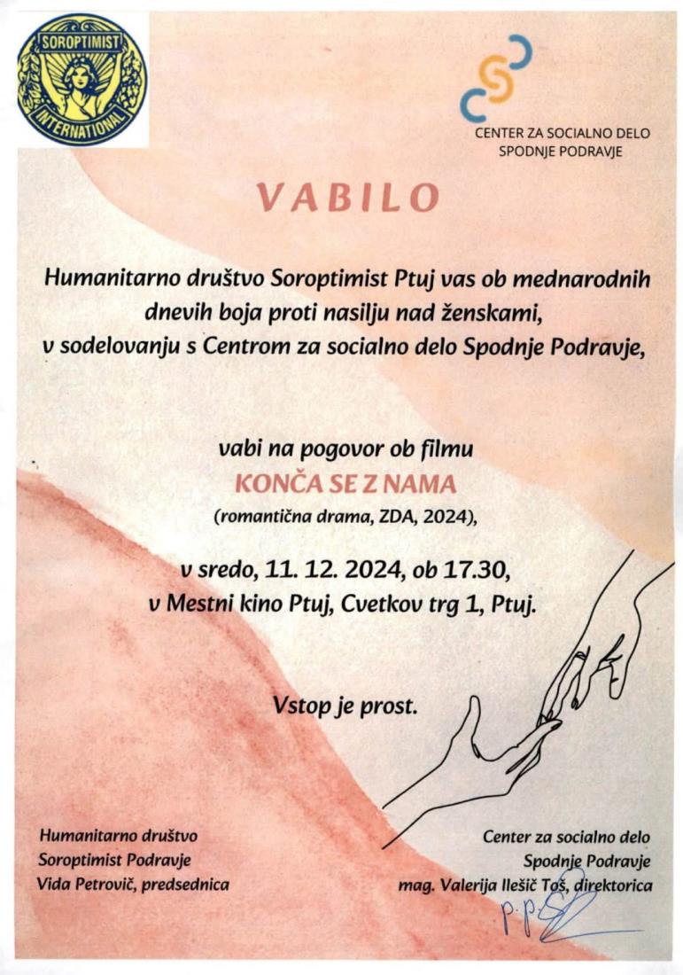 Humanitarno društvo Soroptimist Ptuj vas ob mednarodnih dnevih boja proti nasilju nad ženskami, v sodelovanju s Centrom za socialno delo Spodnje Podravje, vabi na pogovor ob filmu KONČA SE Z NAMA (romantična drama, ZDA, 2024), v sredo, 11. 12. 2024, ob 17.30, v Mestni kino Ptuj, Cvetkov trg 1, Ptuj.