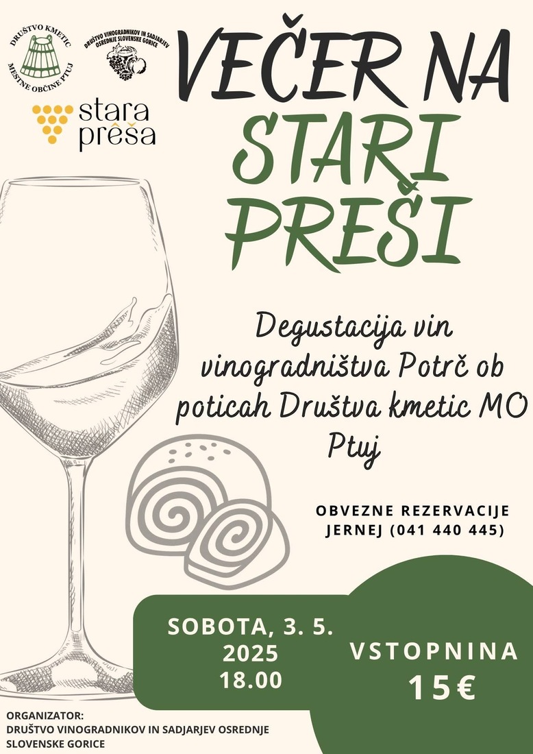 Društvo vinogradnikov in sadjarjev Osrednje Slovenske gorice Vas vabi na prvi letošnji večer na Stari preši, ki bo v soboto, 3. 5. 2025, ob 18. uri.