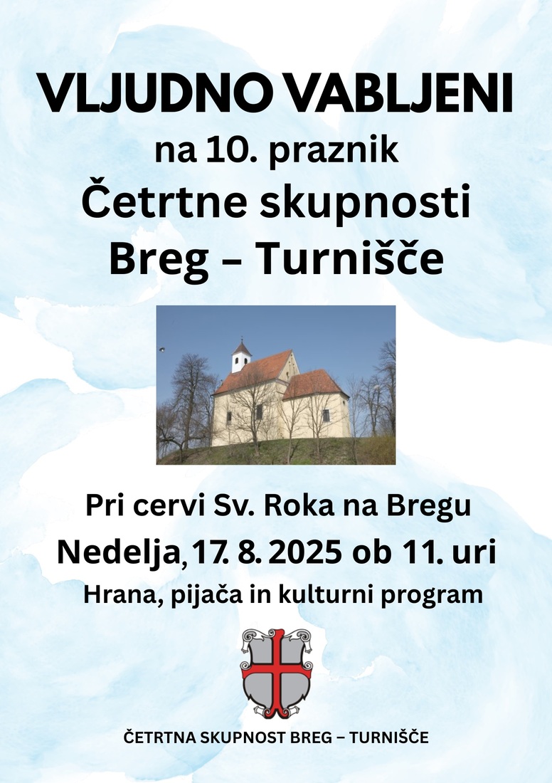 Četrtna skupnost Breg - Turnišče vabi na 10. praznik četrtne skupnosti, ki bo v nedeljo, 17. avgusta, ob 11. uri pri cerkvi Sv. Roka na Bregu. Čaka vas pester kulturni program, poskrbeli pa bodo tudi za hrano in pijačo.