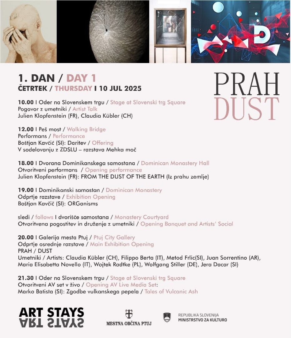 Ob 20. uri se bo v Galeriji mesta Ptuj odprla osrednja festivalska razstava PRAH. Švicarska umetnica Claudia Kübler, se v Galeriji mesta Ptuj predstavlja z instalacijo Best Case, Worst Case, Average Case, ki prikazuje večstoletne sledi v plasteh kamnin in zemlje. Razstavljata tudi Italijana Filippo Berta s simbolnim in konceptualnim video projektom, v sodelovanju z galerijo Prometeo by Ida Pisani, Like the Dust in the Wind, ki raziskuje krhkost in moč človeške identitete, ter Maria Elisabetta Novello z 11687 GRAMMI CIRCA in Archivio Polvere, dvema instalacijama, razstavljenima v sodelovanju z Galleria Fumagalli in Studio Faganel, ki poleg urbanih ostankov predstavljata tudi sodobne najdbe. Sledi delo poljskega umetnika Wojteka Radtkeja, ki se nahaja nekje med umetnostjo in znanostjo ter razmišlja o neizbrisni sledi spomina, ki ostane v DNK živega bitja tudi po njegovem izginotju. Argentinski multidisciplinarni umetnik Juan Sorrentino predstavlja preobrazbo materije in narave v pepel, ki sestavlja njegova zvočna dela. Medtem ko Nemec Wolfgang Stiller v delu Matchstickmen obravnava preobrazbo in metamorfozo človeka, mlada slovenska kiparka Jera Dacar govori o današnji družbi, ki z odtujenostjo od narave proizvaja lasten strup. Razstavo zaključuje Čas nič, monumentalno delo Metoda Frlica, ki po obliki spominja na razbito peščeno uro, metaforo za neizogibnost minevanja časa, ki ga ni mogoče ustaviti.