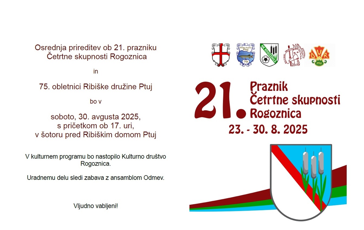Osrednja prireditev ob 21. prazniku Četrtne skupnosti Rogoznica in 70. obletnici Ribiške družine Ptuj bo v soboto, 30. avgusta 2025, s pričetkom ob 17. uri, v šotoru pred Ribiškim domom Ptuj.