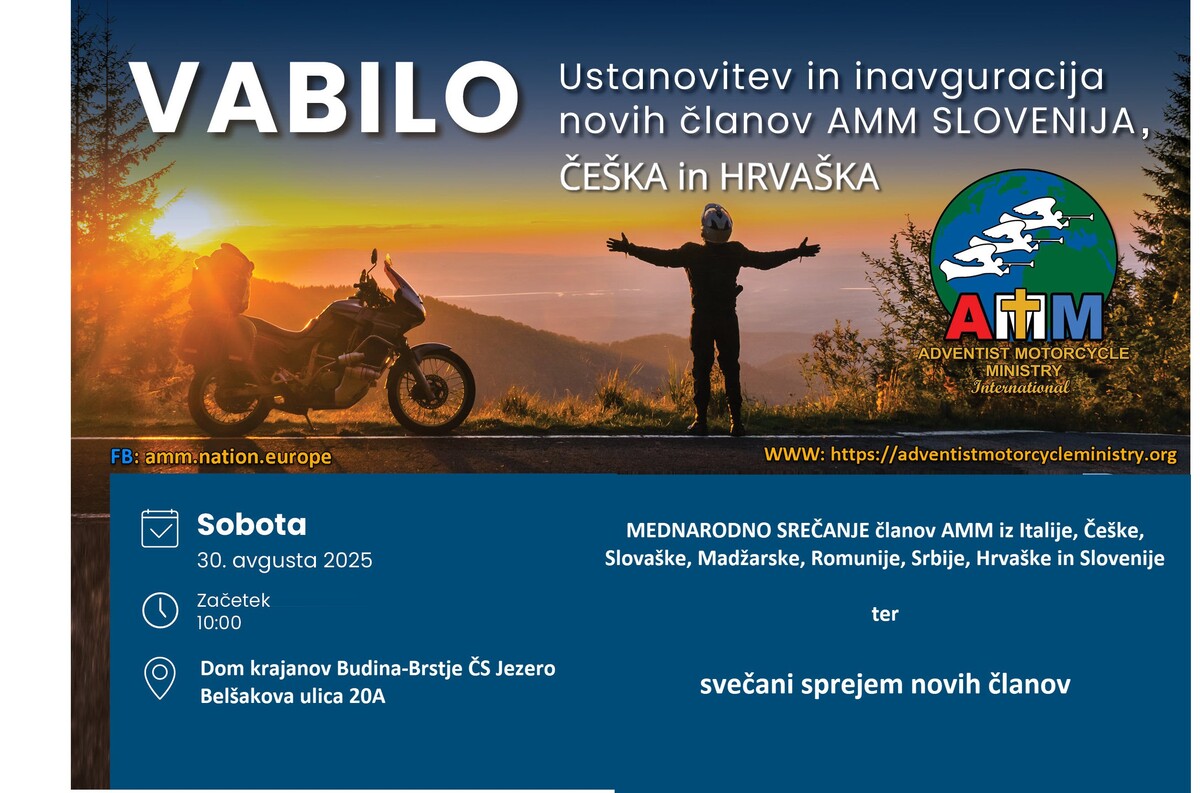 30. avgusta 2025 bomo prvič gostili mednarodno delegacijo Adventist Motorcycle Ministry (AMM) – gibanja, ki združuje motoristične navdušence iz različnih držav, ki s svojo strastjo do vožnje povezujejo z duhovnostjo in služenjem skupnosti ter hkrati opozarjajo na varnost enoslednih motornih vozil.