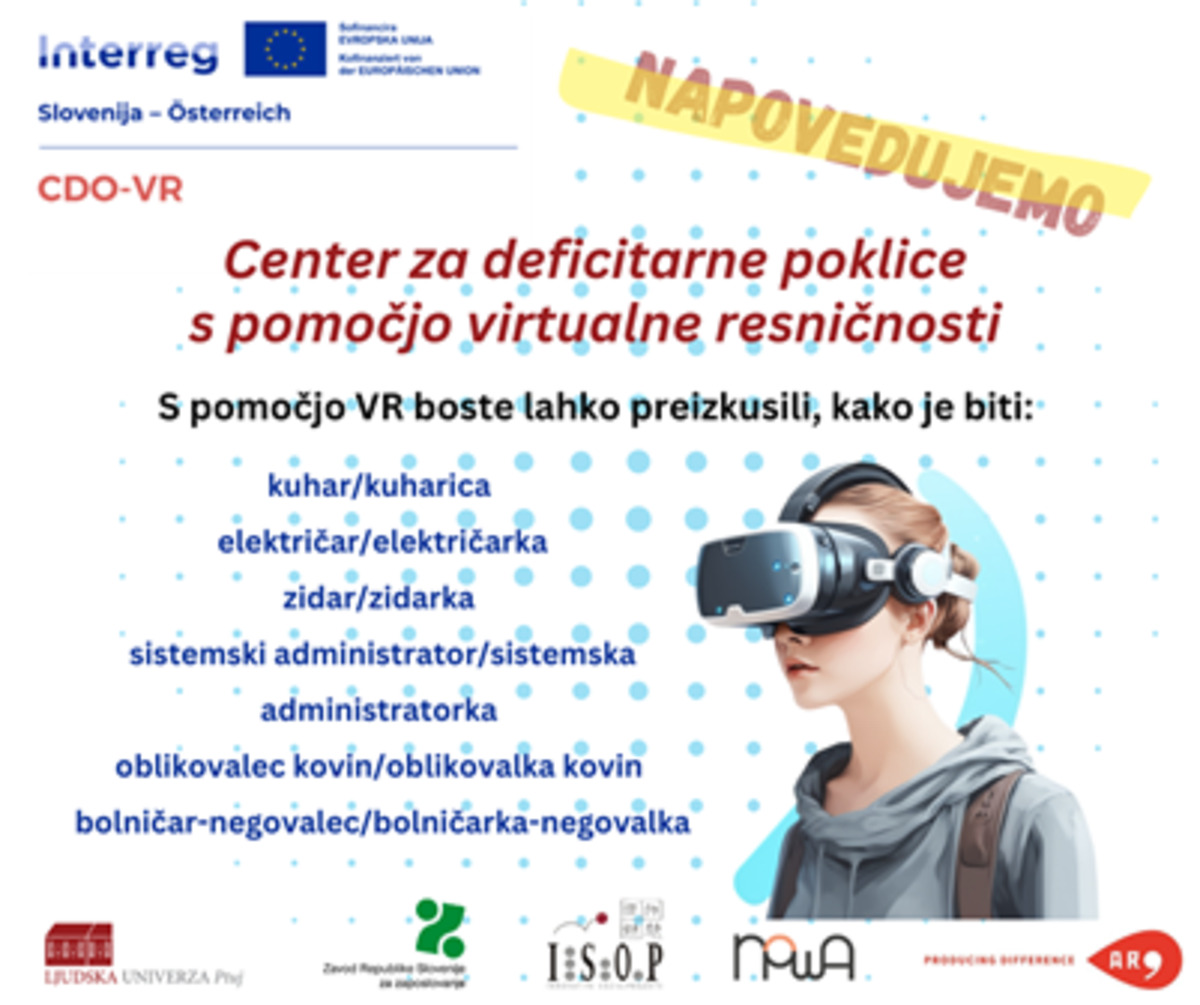 Ljudska univerza Ptuj si skupaj s partnerji iz Slovenije in Avstrije prizadeva z inovativnimi in tehnološko naprednimi pristopi pri mladih vzbuditi interes za deficitarne poklice, v katerih delodajalcem primanjkuje kadra. Center za deficitarne poklice s pomočjo VR je plod projekta CDO-VR, ki je v okviru programa Interreg Slovenija-Avstrija sofinanciran s sredstvi Evropskega sklada za regionalni razvoj (ESSR).