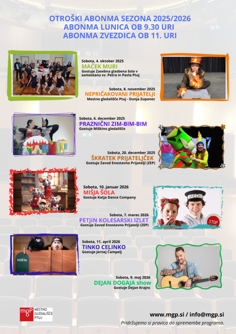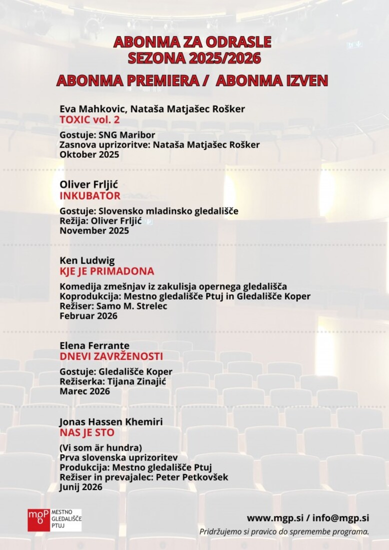 Mestno gledališče Ptuj obvešča, da še vedno poteka vpis v abonma za odrasle in otroke za sezono 2025/2026 in sicer vse do 26. 9. 2025.