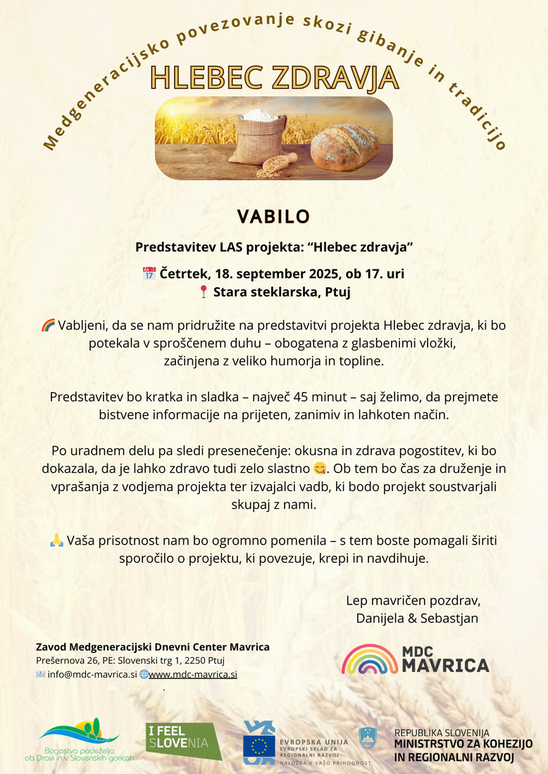 Zavod MDC Mavrica, kot prijavitelj v sodelovanju s partnerjem Društvom podeželskih žena Markovci, vabi na predstavitev evropsko sofinanciranega projekta Hlebec zdravja, ki je del programa LAS Bogastvo podeželja (ESRR). Projekt bo s svojimi aktivnostmi prinašal nove priložnosti za prebivalce Ptuja, Markovcev, Dornave in Kidričevega ter spodbujal medgeneracijsko sodelovanje, zdrav življenjski slog in ohranjanje kulturne dediščine.
