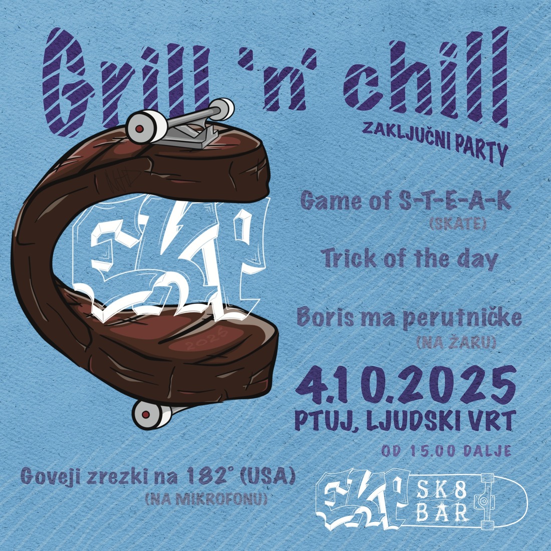 Pripravili smo nekaj malega, nič na v'l'ko, za vse, ki bi nekam ven, pa ne vedo kam. Boris bo pekel perutničke, špilal se bo PS5 in igra SKATE, če nam bo naklonjeno vreme, bomo vdarili tudi game of S-T-E-A-K (pravila game of skate), ki bo primerno nagrajen. Zvečer, tam nekje okrog 21.03 bo pa na sporedu koncert skupine Đuro in Goveji Zrezki na 182°. V glavnem to bo en lep Grill'n'Chill eventič, za zaključek sezone.