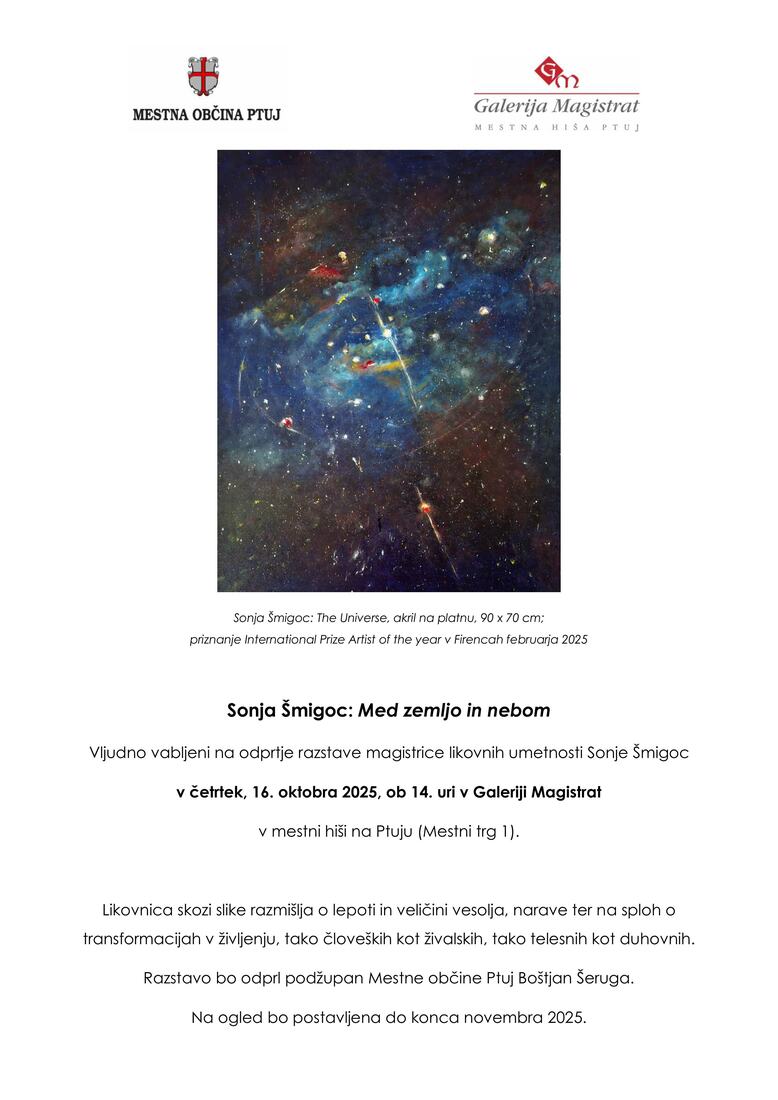 Vljudno vabljeni na odprtje razstave magistrice likovnih umetnosti Sonje Šmigoc z naslovom Med zemljo in nebom, ki bo v četrtek, 16. oktobra 2025, ob 14. uri v Galeriji Magistrat v mestni hiši na Ptuju (Mestni trg 1).
