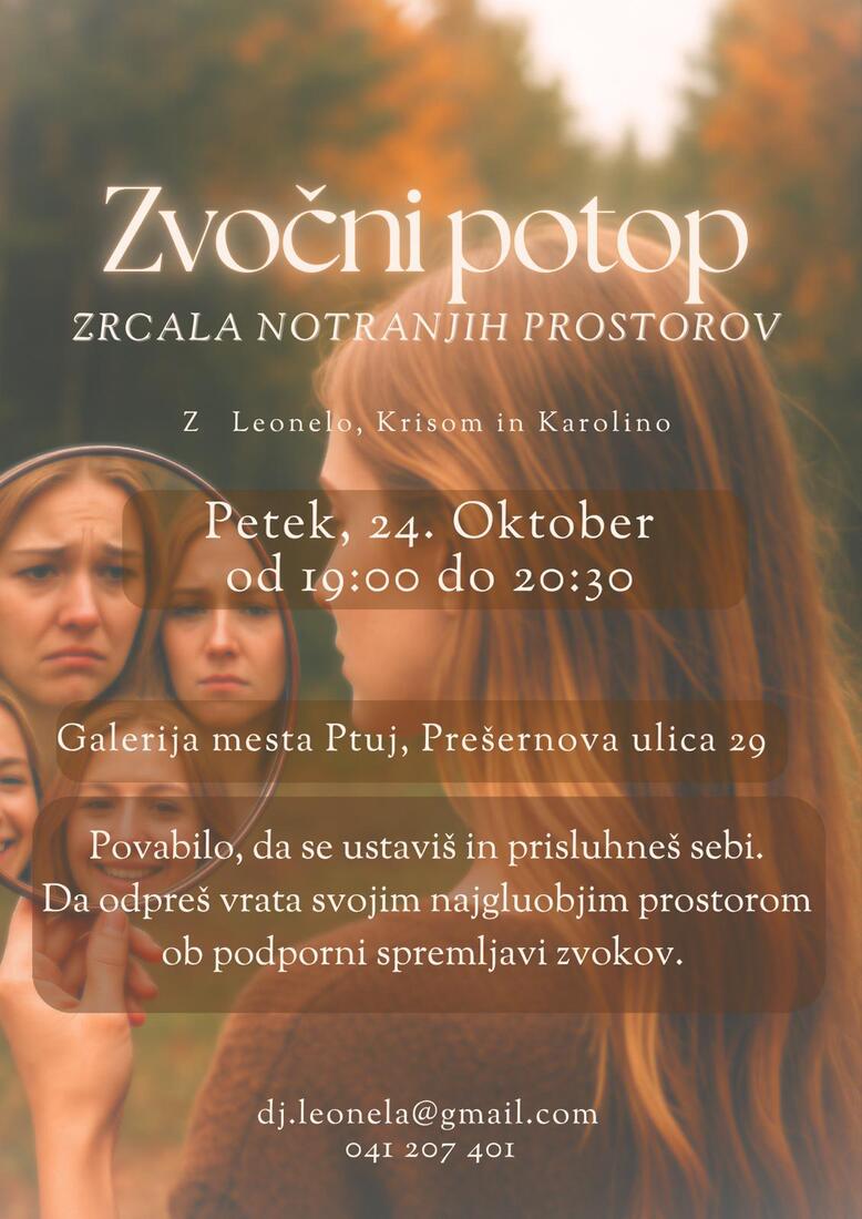 V vsakem izmed nas živijo prostori - nekateri so polni svetlobe in topline, drugi tišji, zaviti v sence in spomine. Pogosto jih preslišimo, spregledamo, zapremo vrata in nadaljujemo naprej ... a vendar nas ti prostori nežno kličejo, da se vrnemo. Zvočni potop je povabilo, da se za trenutek ustaviš in prisluhneš sebi, da sedeš na prag svojega srca in odpreš vrata prostorom, ki jih redko obiščeš - tistim, kjer so skriti občutki, misli, morda davno pozabljene zgodbe. Ni treba ničesar spreminjati, dovolj je, da opazuješ in čutiš - kakor bi skozi okno opazoval notranjo pokrajino, ki jo nežno oplazi dih zvoka.