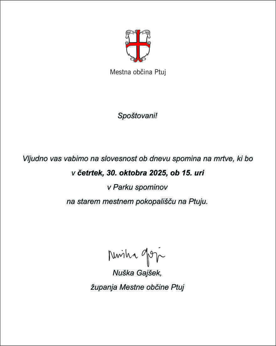 Vljudno vabljeni na slovesnost ob dnevu spomina na mrtve, ki bo v četrtek, 30. oktobra 2025, ob 15. uri v Parku spominov na starem mestnem pokopališču na Ptuju.