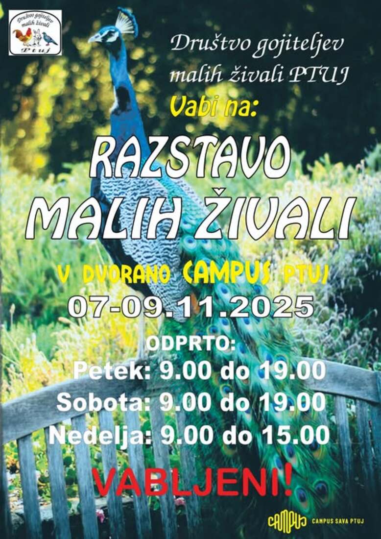 Društvo gojiteljev malih živali Ptuj prireja 45. meddruštveno razstavo malih pasemskih živali z meddržavno udeležbo, ki bo potekala v večnamenski dvorani Campus Sava, Žnidaričevo nabrežje 2, 2250 Ptuj, med 7. 11. 2025 in 9. 11. 2025.