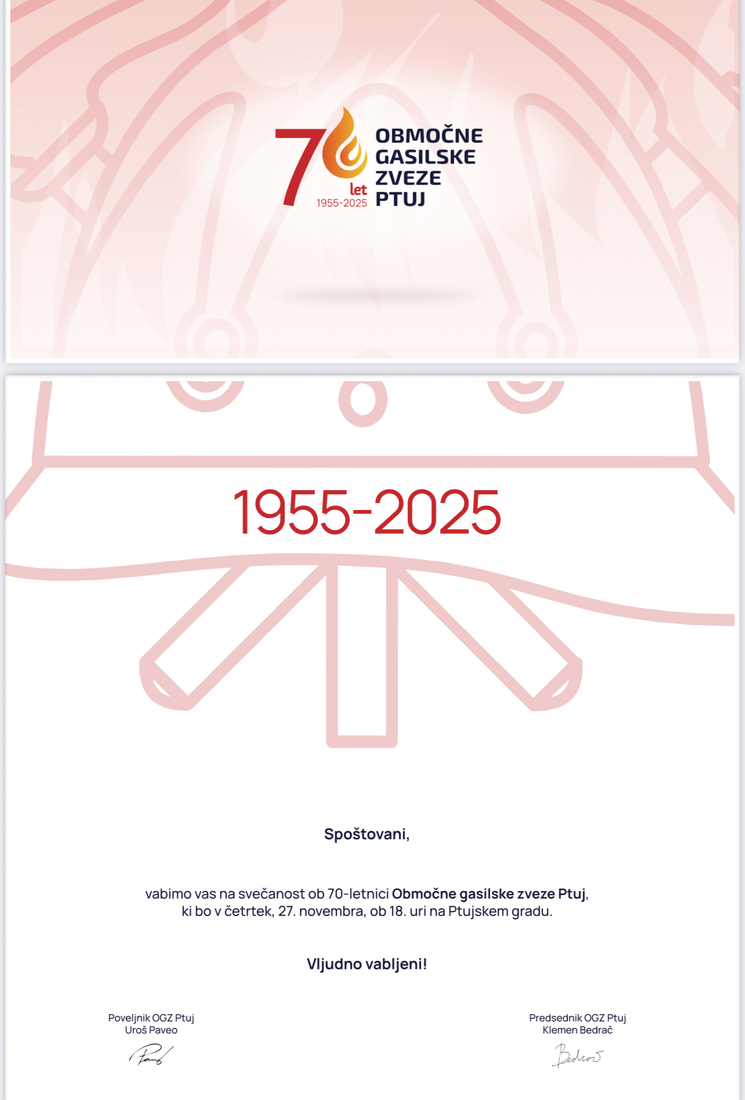 vabimo vas na svečanost ob 70-letnici Območne gasilske zveze Ptuj, ki bo v četrtek, 27. novembra, ob 18. uri na Ptujskem gradu.