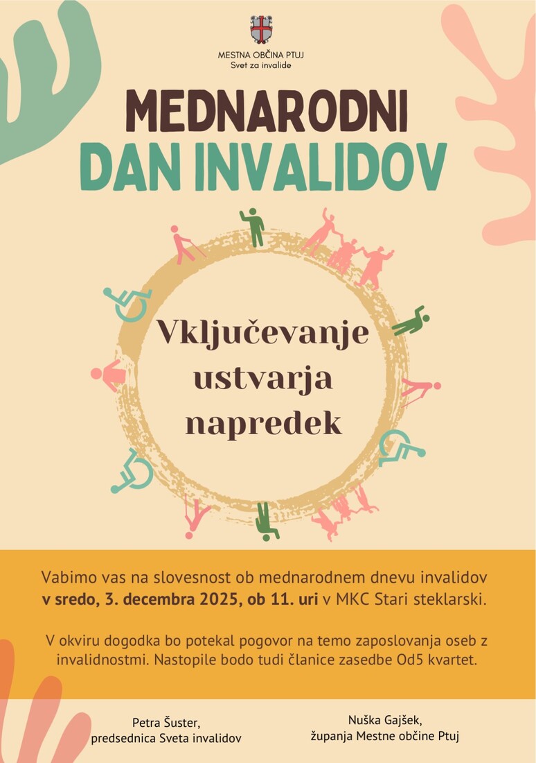 Mestna občina Ptuj in Svet za invalide Mestne občine Ptuj vabimo na slovesnost ob mednarodnem dnevu invalidov, ki bo 3. decembra 2025, ob 11. uri v MKC Stara steklarska.