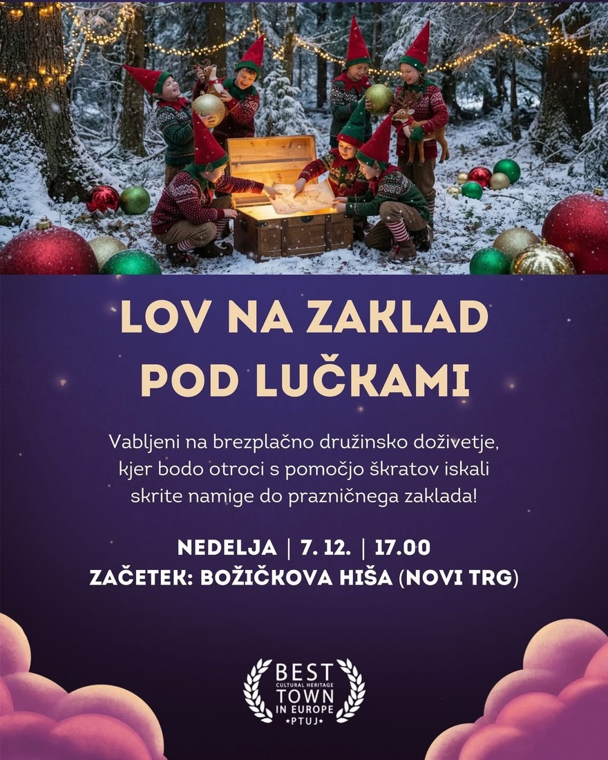 V čarobnem mestu Ptuj se bo v nedeljo odvijala domiselna božična igra 🕵️♀️ Lov na zaklad pod lučkami, kjer bodo otroci, s pomočjo prijaznih škratov, iskali skrite namige do zaklada.