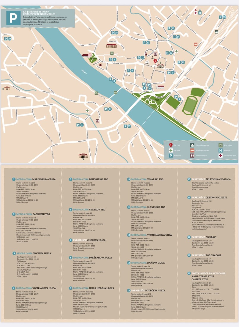 Dobrodošli na Ptuju 👋, kjer je parkiranje enostavno in priročno 🚗✨. V mestu je na voljo veliko javnih parkirišč, izpostavljamo pa 19 lokacij 🅿️, ki vključujejo parkirišča z več parkirnimi mesti – tako brezplačnimi 🆓 kot plačljivimi 💶.