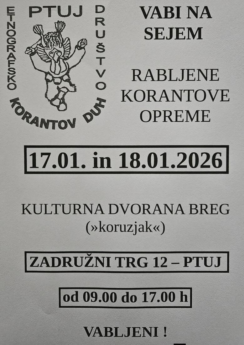 Etnografsko društvo Korantov duh vabi na sejem rabljene korantove opreme, ki bo v soboto, 17. januarja in v nedeljo, 18. januarja 2026, od 9. do 17. ure v Kulturni dvorani Breg na Zadružnem trgu.