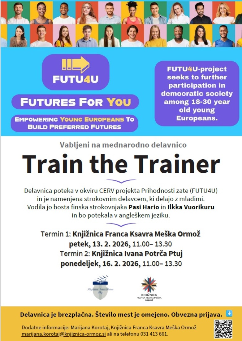 16. februarja ob 11. uri v razstavišču knjižnice mednarodna delavnica Train the Trainer. Delavnica poteka v okviru CERV projekta Prihodnosti zate (FUTU4U) in je namenjena strokovnim delavcem, ki delajo z mladimi. Vodila jo bosta finska strokovnjaka Pasi Hario in Ilkka Vuorikuru in bo potekala v angleškem jeziku. Delavnica je brezplačna. Število mest je omejeno. Obvezna prijava.
