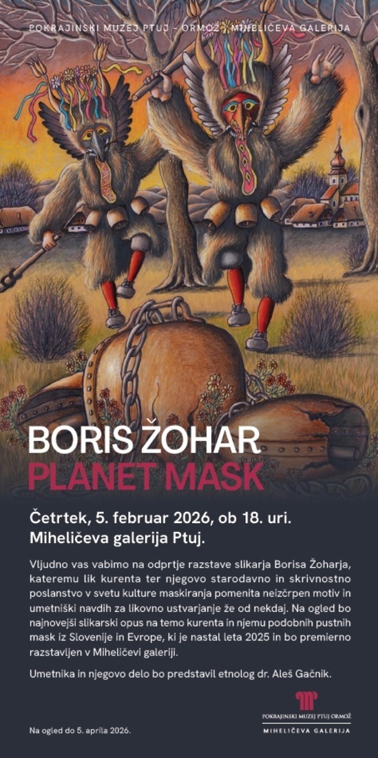 Slikarju Borisu Žoharju lik kurenta ter njegovo starodavno in skrivnostno poslanstvo v svetu kulture maskiranja že od nekdaj pomenita neizčrpen motiv in umetniški navdih za likovno ustvarjanje. Na ogled bo najnovejši slikarski opus na temo kurenta in njemu podobnih pustnih mask iz Slovenije in Evrope, ki je nastal leta 2025 in bo premierno razstavljen v Miheličevi galeriji. Umetnika in njegovo delo bo predstavil etnolog dr. Aleš Gačnik. Razstava bo na ogled do 5. aprila 2026.
