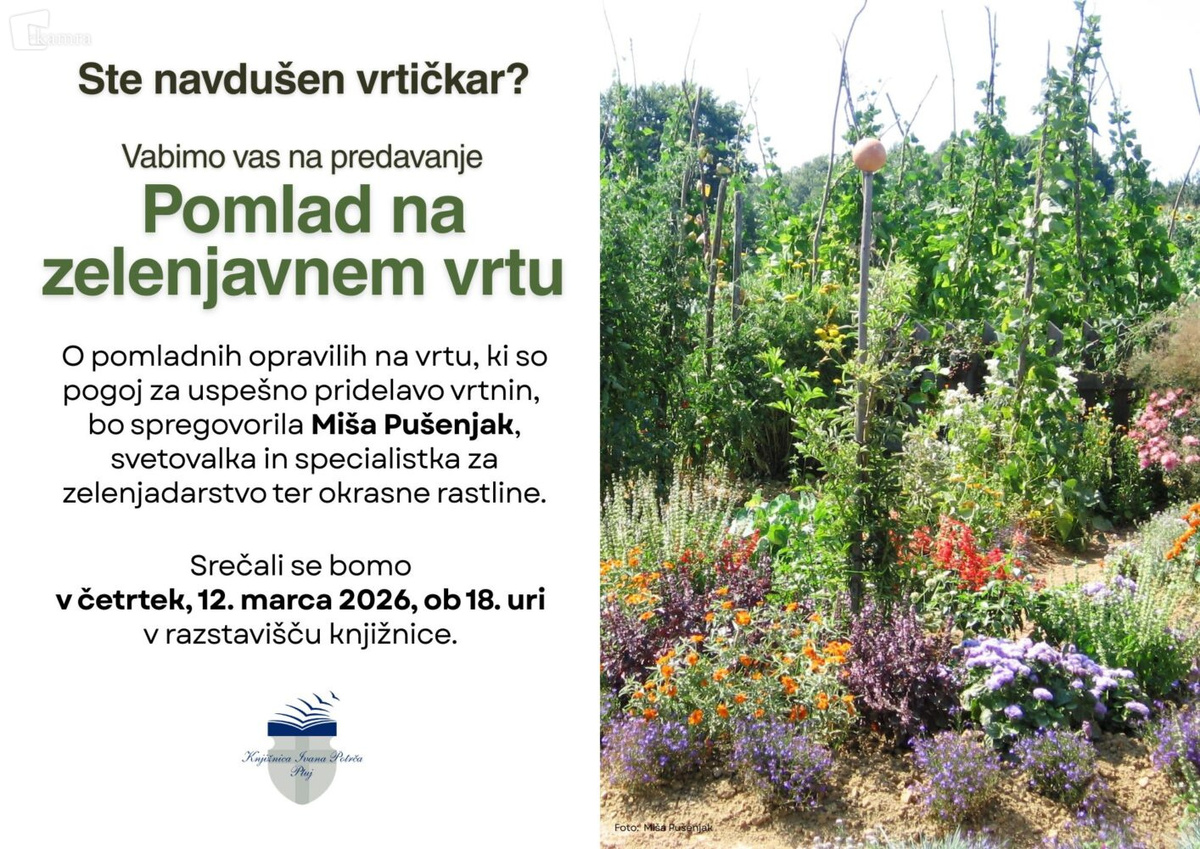 Knjižnica Ivana Potrča Ptuj vabi na predavanje Miše Pušenjak, Ptujčanke, svetovalke in specialistke za zelenjadarstvo in okrasne rastline. Spregovorila bo o spomladanskih opravilih na vrtu, ki so pogoj za uspešno pridelavo vrtnin. Srečali se bomo 12. marca 2026, ob 18.00 v razstavišču knjižnice.