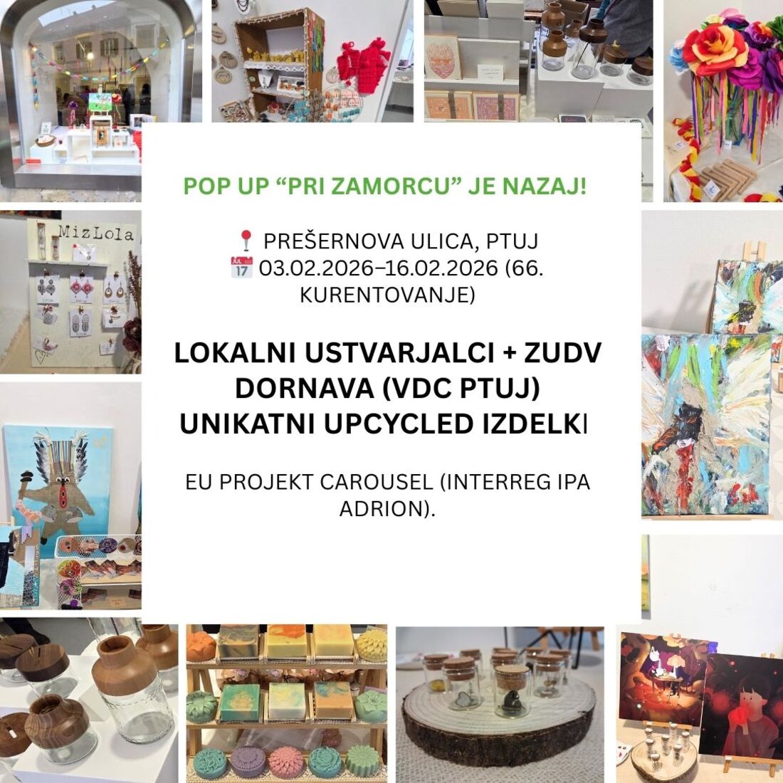 POP up trgovina – Art kolektiva »Pri zamorcu«, je bila odprta v letih 2024 ter 2025, vsakič za obdobje treh mesecev. Takrat je trgovina zasledovala cilje projekta NiCE - Od niše do središča - mestna središča v krožnem življenjskem slogu (Interreg Srednja Evropa). Tokratno odprtje je plod s strani ZRS Bistra Ptuj pridobljenega projekta CARUSEL (Interreg IPA ADRION), ki ga znova sofinancira Evropska unija.