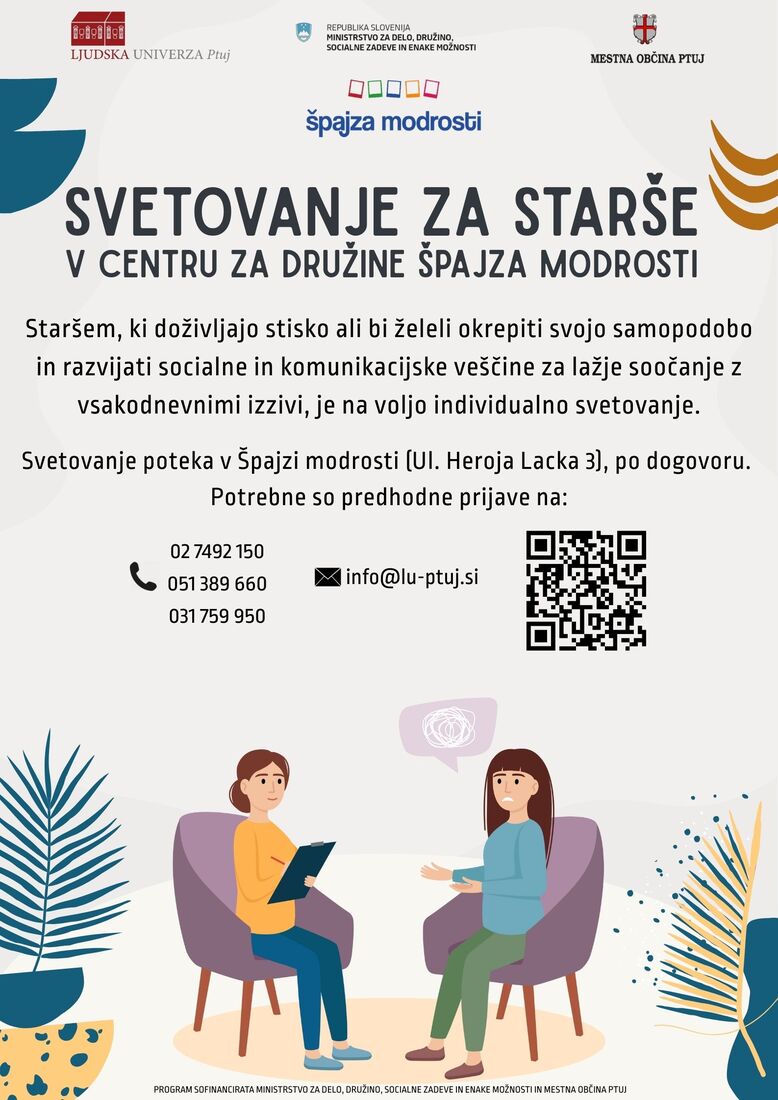 Staršem, ki doživljajo stisko ali bi želeli okrepiti svojo samopodobo in razvijati socialne in komunikacijske veščine za lažje soočanje z vsakodnevnimi izzivi, je na voljo individualno svetovanje, ki ga izvajajo strokovni sodelavci Centra za družine Špajza modrosti.