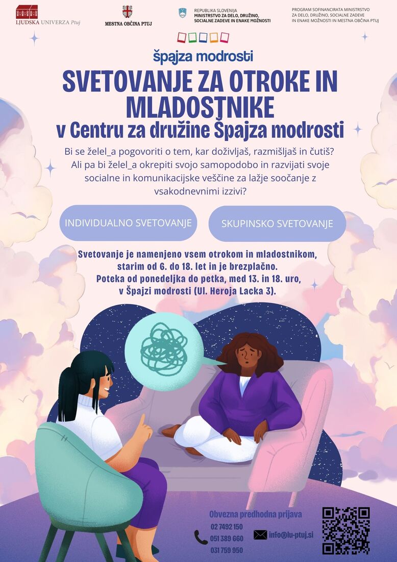 Individualno in skupinsko svetovanje otrokom in mladostnikom med 6. in 18. letom starosti. Namen svetovanja je krepiti njihovo duševno zdravje, samopodobo ter razvijanje socialnih in komunikacijskih veščin. Otrokom bo na voljo varen in spodbuden prostor, kjer bodo lahko izražali svoja čustva, se učili prepoznavati stresne situacije ter pridobivali orodja za lažje soočanje z vsakodnevnimi izzivi v šoli in domačem okolju. Svetovanje je namenjeno tudi otrokom in mladostnikom, ki doživljajo stisko in se soočajo s prekomerno rabo digitalnih naprav.
