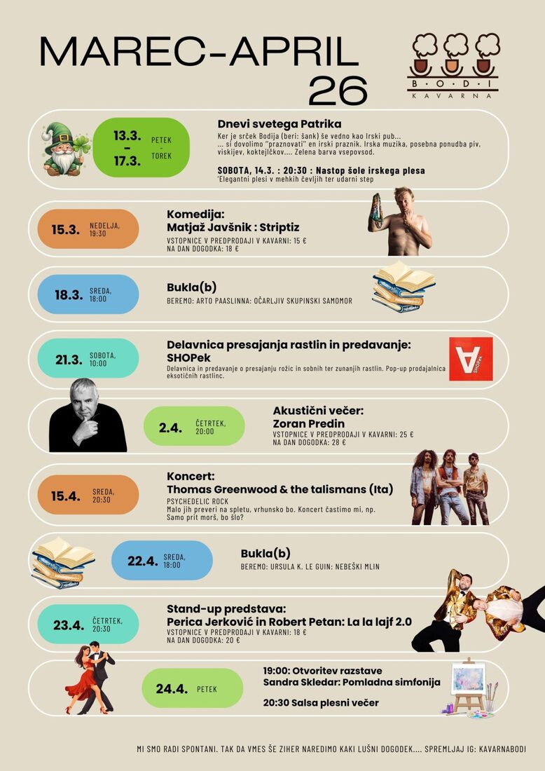 Bliža se pomlad in v kavarni Bodi so za vas pripravili pester program dogodkov — od petdnevnega praznovanja dneva svetega Patrika, do stand-up dogodkov, bralnih klubov, razstav, koncertov…