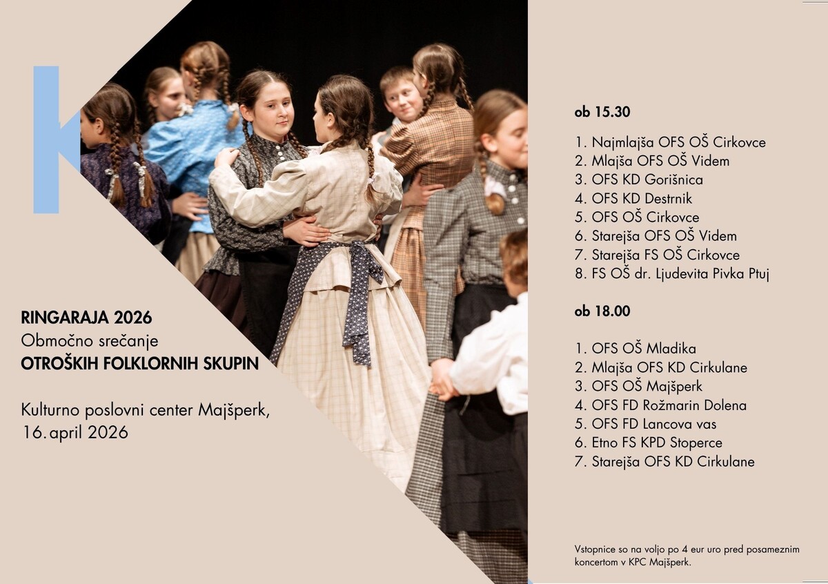- KPC Majšperk, 16. april 2026, ob 15.30 in 18.00 – RINGARAJA 2026, območno srečanje otroških folklornih skupin;