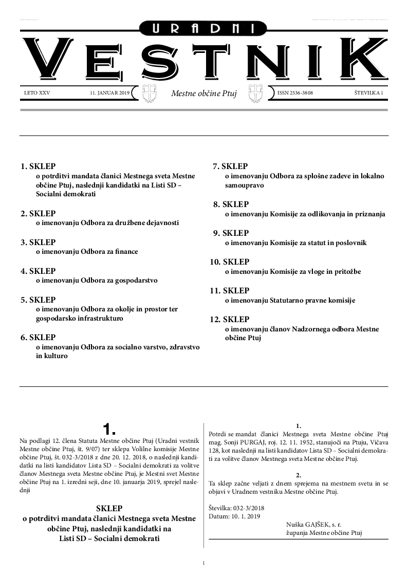 Sklep o potrditvi mandata članici Mestnega sveta Mestne občine Ptuj, naslednji kandidatki na Listi SD – Socialni demokrati (Uradni vestnik Mestne občine Ptuj, št. 1/2019)