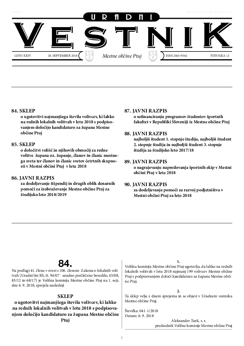 Sklep o ugotovitvi najmanjšega števila volivcev, ki lahko na rednih lokalnih volitvah v letu 2018 s podpisovanjem določijo kandidaturo za župana Mestne občine Ptuj (Uradni vestnik Mestne občine Ptuj, št. 12/2018)