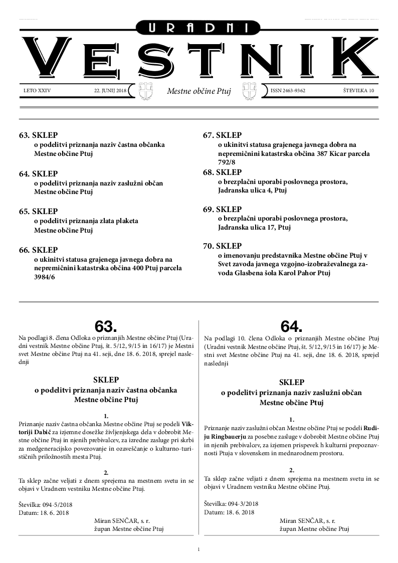 Sklep o podelitvi priznanja naziv častna občanka Mestne občine Ptuj (Uradni vestnik Mestne občine Ptuj, št. 10/2018)