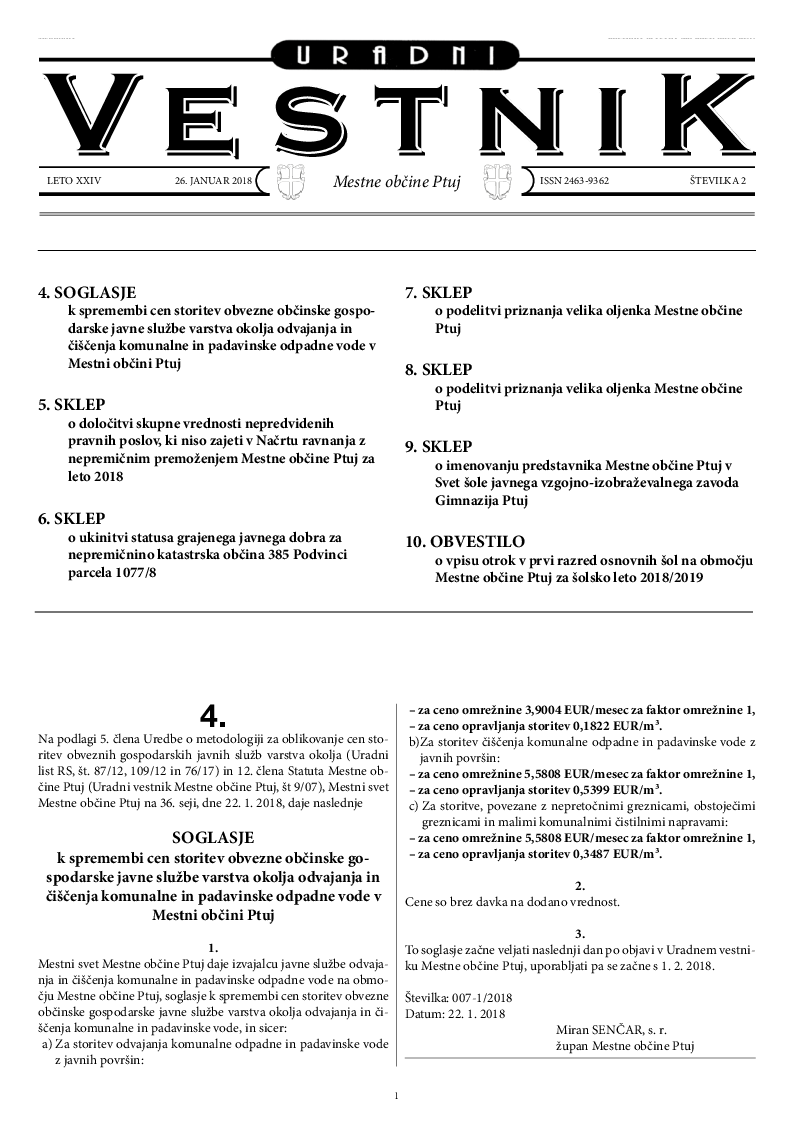 Soglasje k spremembi cen storitev obvezne občinske gospodarske javne službe varstva okolja odvajanja in čiščenja komunalne in padavinske odpadne vode v Mestni občini Ptuj (Uradni vestnik Mestne občine Ptuj, št. 2/2018)