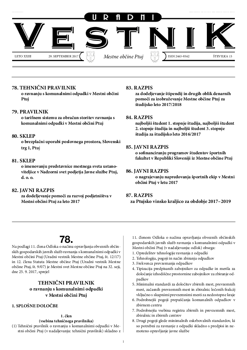 Tehnični pravilnik o ravnanju s komunalnimi odpadki v Mestni občini Ptuj (Uradni vestnik Mestne občine Ptuj, št. 15/2017)