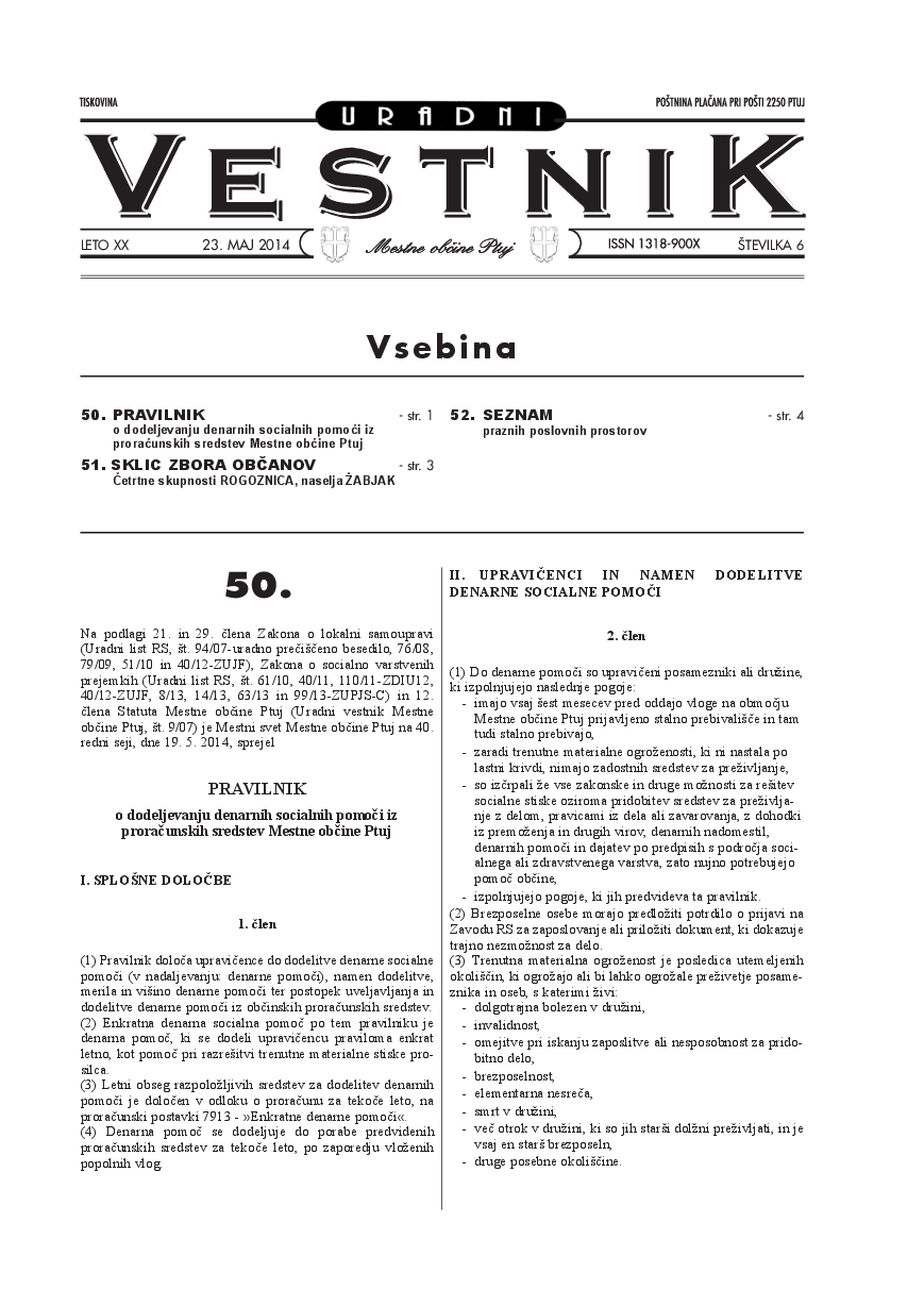 Pravilnik o dodeljevanju denarnih socialnih pomoči iz proračunskih sredstev Mestne občine Ptuj (Uradni vestnik Mestne občine Ptuj, št. 6/2014)
