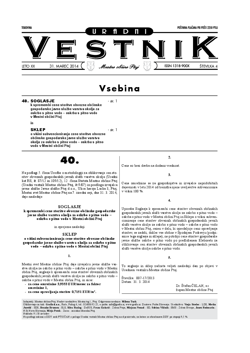 Soglasje in Sklep o višini subvencioniranja cene storitve obvezne občinske gospodarske javne službe varstva okolja za oskrbo s pitno vodo – oskrba s pitno vodo v Mestni občini Ptuj (Uradni vestnik Mestne občine Ptuj, št. 4/2014)