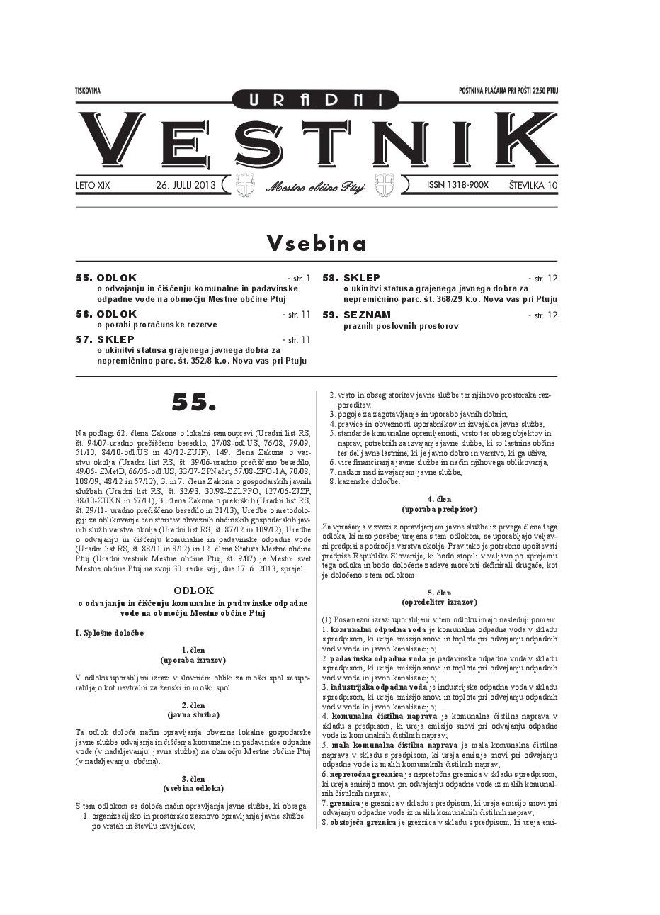 Odlok o odvajanju in čiščenju komunalne in padavinske odpadne vode na območju Mestne občine Ptuj (Uradni vestnik Mestne občine Ptuj, št. 10/2013)
