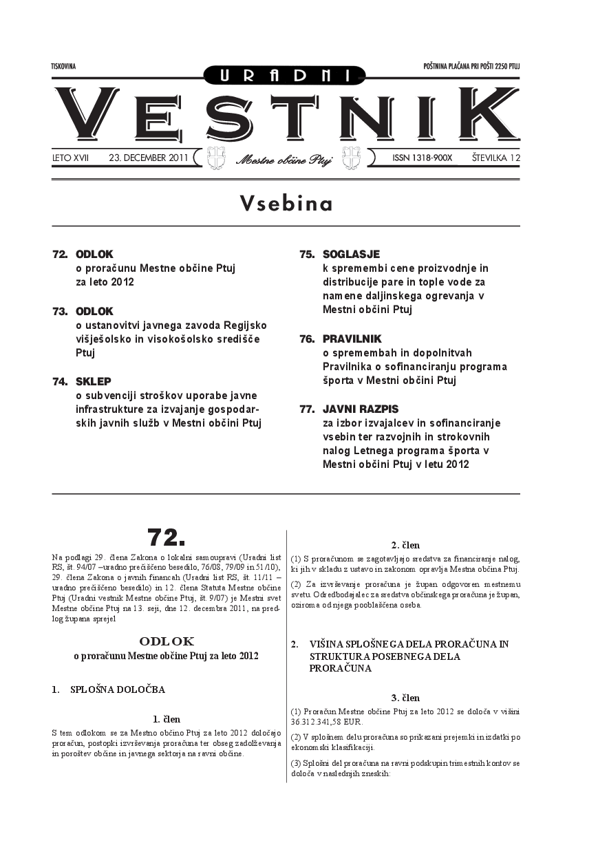 Odlok o proračunu Mestne občine Ptuj za leto 2012 (Uradni vestnik Mestne občine Ptuj, št. 12/2011)