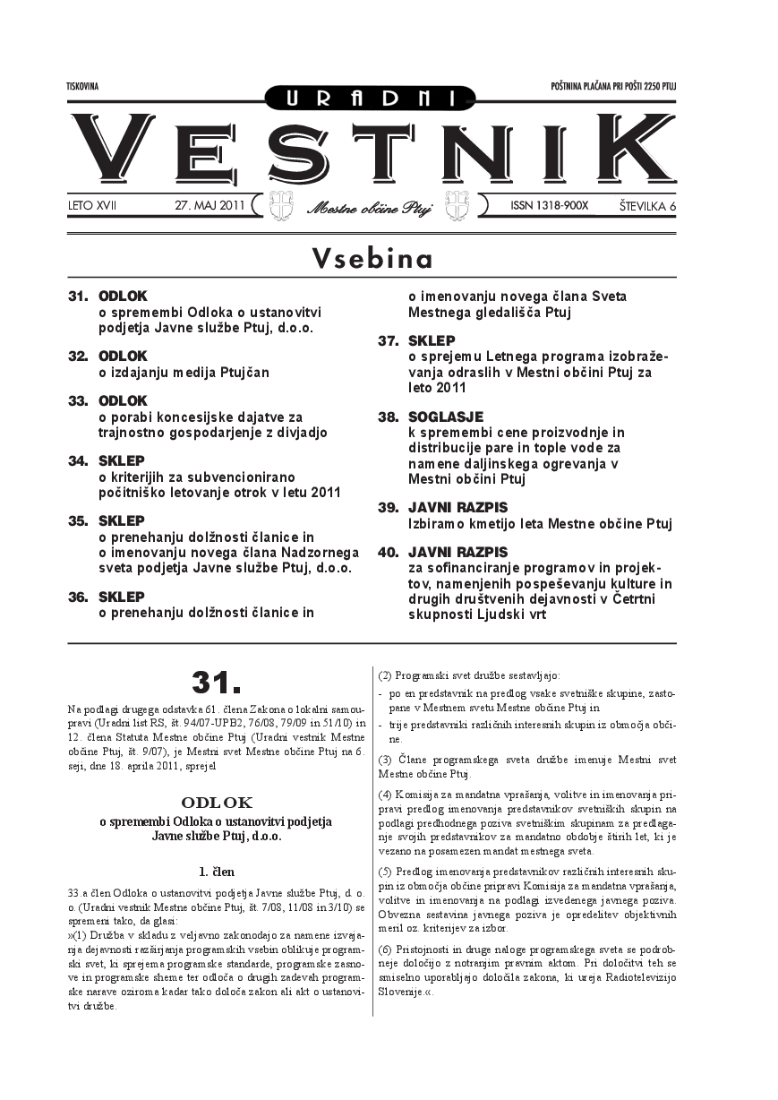 Odlok o izdajanju medija Ptujčan (Uradni vestnik Mestne občine Ptuj, št. 6/2011)