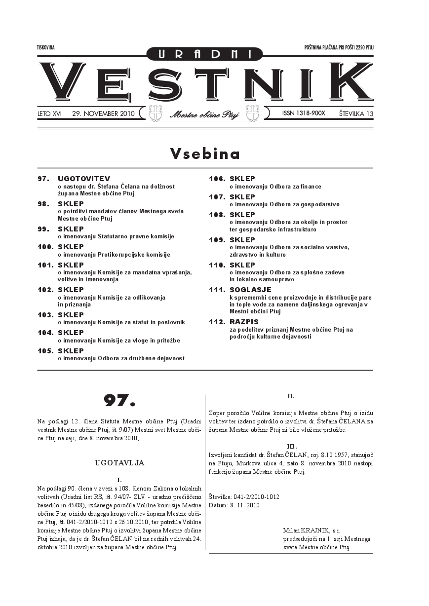Ugotovitev o nastopu dr. Štefana Celana na dolžnost župana Mestne občine Ptuj (Uradni vestnik Mestne občine Ptuj, št. 13/2010)