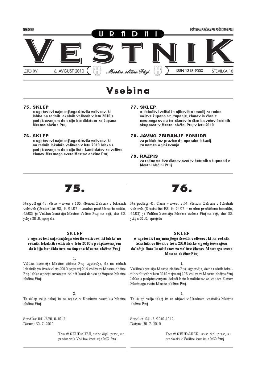Sklep o ugotovitvi najmanjšega števila volivcev, ki lahko na rednih lokalnih volitvah v letu 2010 s podpisovanjem določijo kandidaturo za župana Mestne občine Ptuj (Uradni vestnik Mestne občine Ptuj, št. 10/2010)