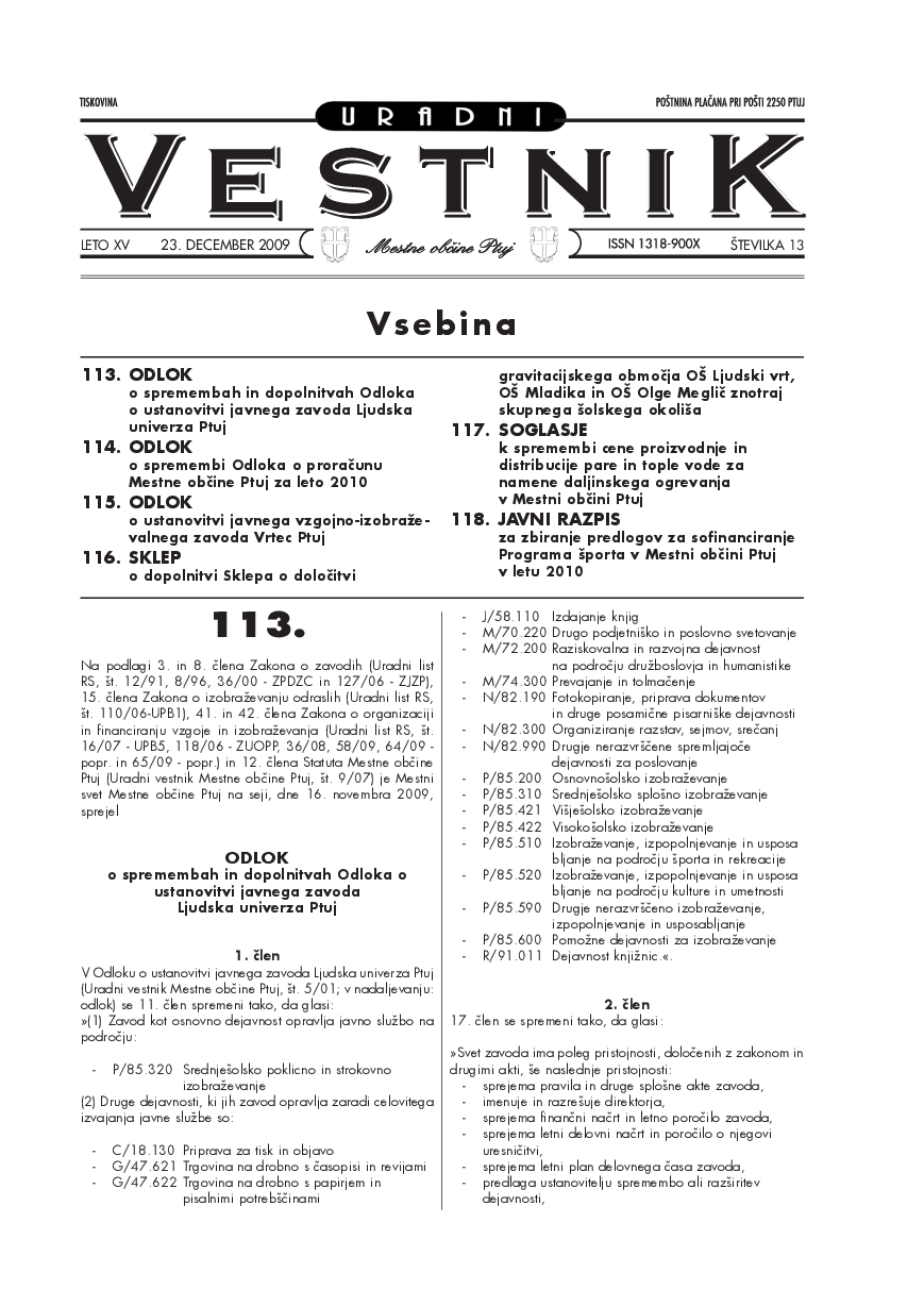 Odlok o spremembah in dopolnitvah Odloka o ustanovitvi javnega zavoda Ljudska univerza Ptuj (Uradni vestnik Mestne občine Ptuj, št. 13/2009)