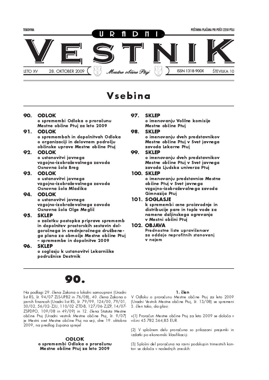 Odlok o spremembi Odloka o proračunu Mestne občine Ptuj za leto 2009 (Uradni vestnik Mestne občine Ptuj, št. 10/2009)