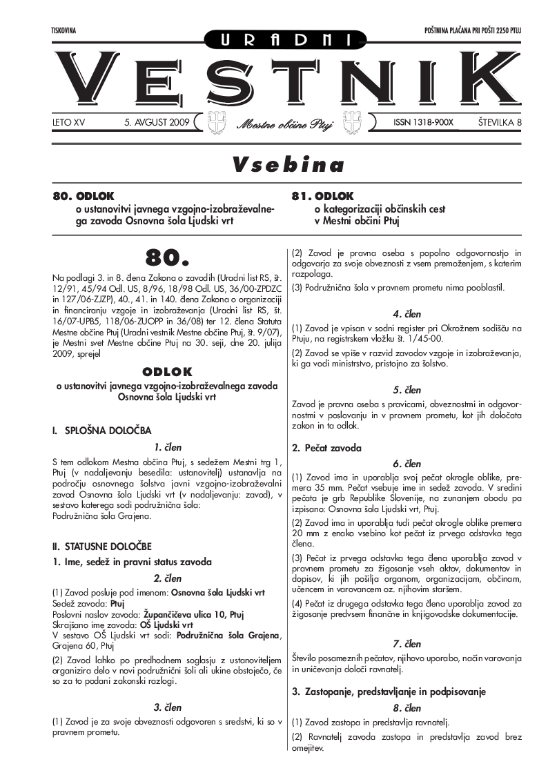 Odlok o ustanovitvi javnega vzgojno-izobraževalnega zavoda Osnovna šola Ljudski vrt (Uradni vestnik Mestne občine Ptuj, št. 8/2009)