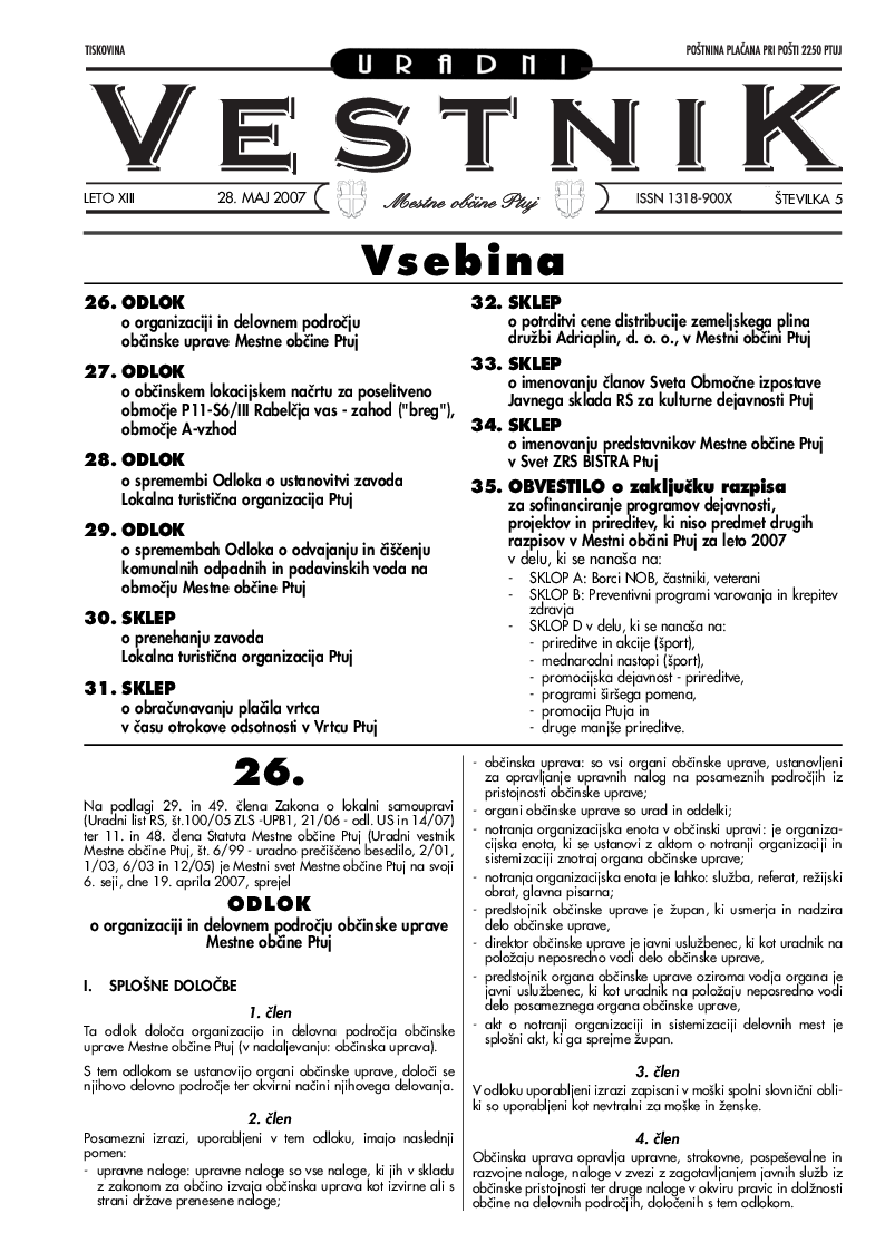 Odlok o organizaciji in delovnem področju občinske uprave Mestne občine Ptuj (Uradni vestnik Mestne občine Ptuj, št. 5/2007)